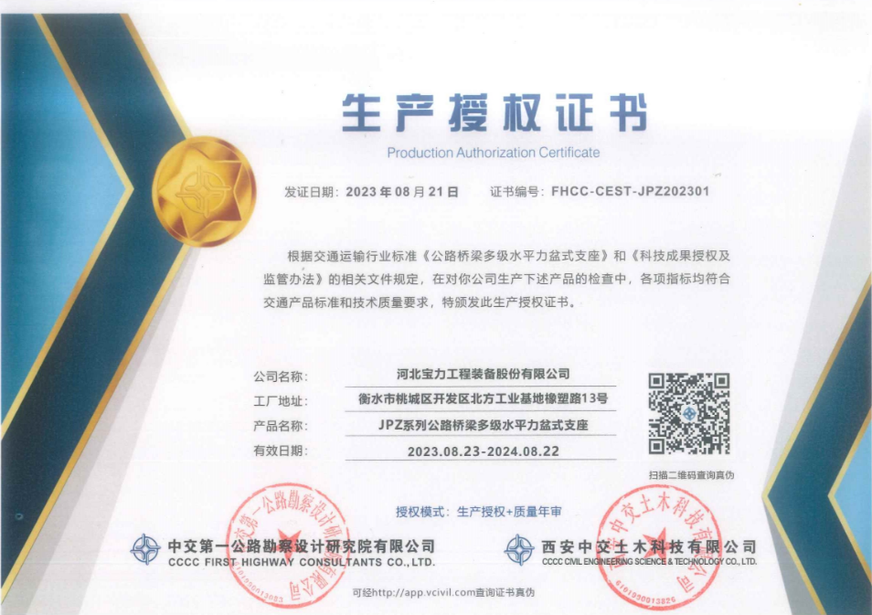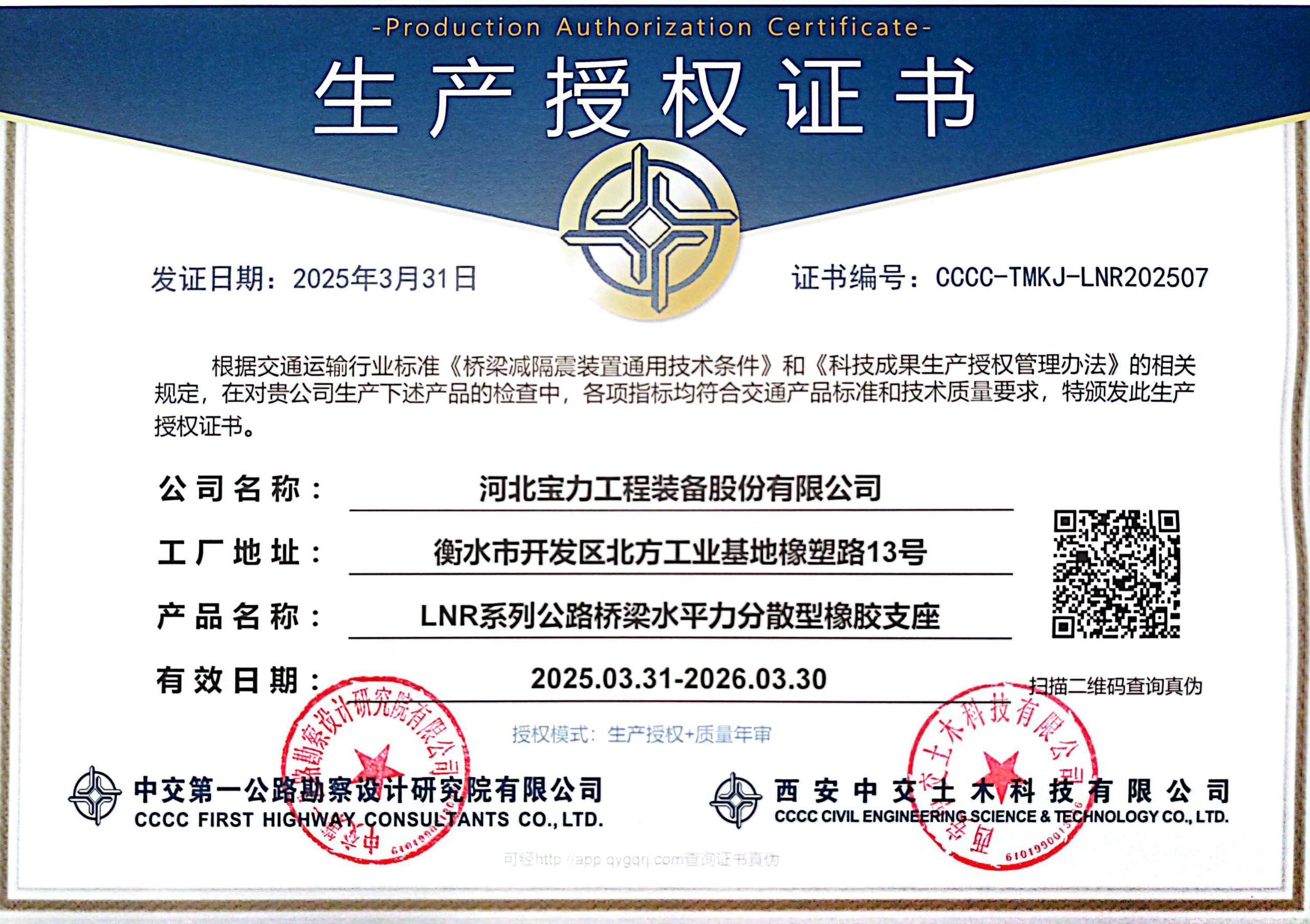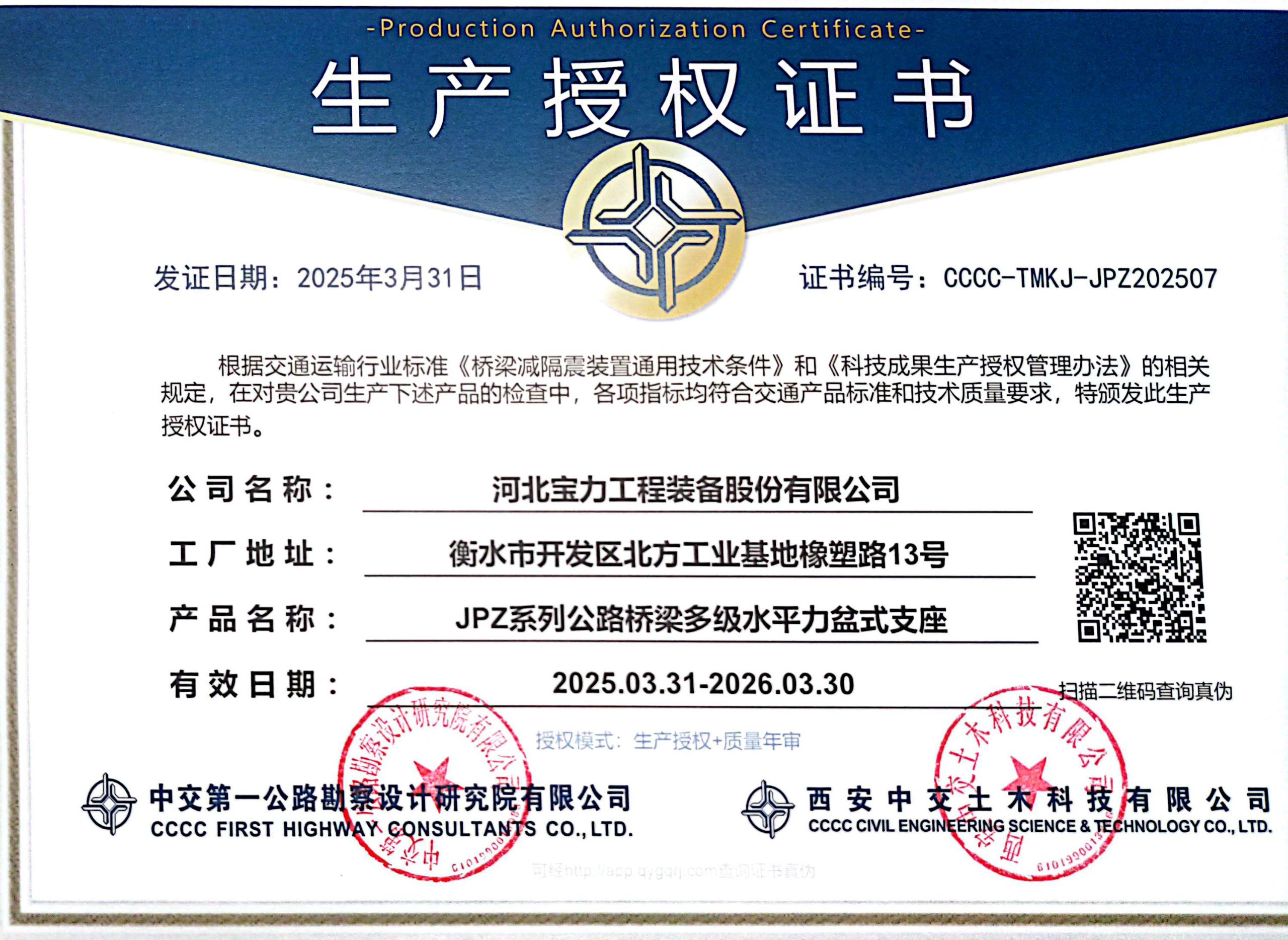 河北宝力工程装备股份有限公司地处衡水市高新技术开发区,创建于1996年,主导产品有:桥梁支座、桥梁阻尼器、建筑隔震支座、建筑阻尼器、电气化铁路接触网金具、桥梁伸缩装置、桥梁结构件和水利、隧道防水材料、通讯光缆护套、土工格栅、机车轨道减震器材以及工业胶辊等。公司将“转型升级”作为公司发展战略的重要组成部分,大力推动传统产业改造提升,坚持高质量发展、绿色发展。公司坚持产学研一体化道路,为河北省企业技术中心、河北省科技专家企业工作站、河北省工程橡胶工程技术研究中心、河北省有机氟塑料及应用产业技术研究院(共建)、河北省工业设计中心、河北省博士后创新实践基地。公司坚持以品牌打造市场,以诚信赢得市场的发展理念,实现品牌诚信经营,并获得多项荣誉。公司获得河北省政府质量奖、河北省高新技术企业、河北省质量效益型先进企业、河北省科技型企业、河北省创新引领型领军企业、河北省标准化创新突出企业、河北省科技领军企业、河北省绿色工厂等。